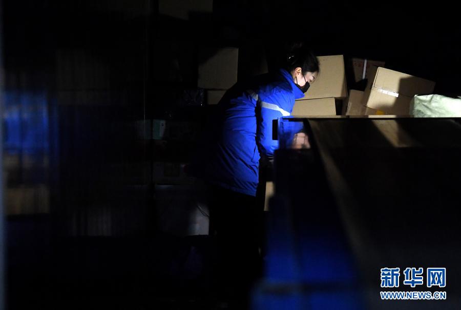 快递分拣员王书玲在中通快递河南公司郑州分拨中心码放快递(1月21日摄)。新华社记者李安摄