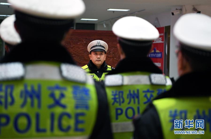 郑州市公安局交通警察支队第六大队夜巡中队中队长王兵在工作开始前点名安排分工(1月25日摄)。新华社记者李安摄
