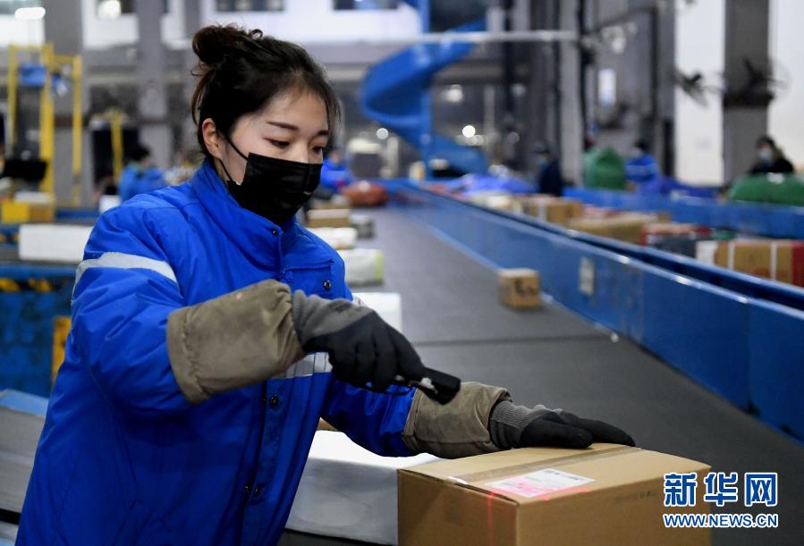 王书玲在中通快递河南公司郑州分拨中心扫描分拣快递(1月21日摄)。王书玲是一名快递分拣员,每天夜里她要连续工作近9个小时,分拣8000多件快递包裹。新华社记者李安摄