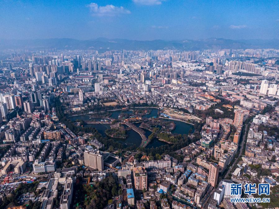 从中共云南地下党建党旧址上空俯瞰昆明城区(无人机照片,1月22日摄)。新华社记者 江文耀 摄