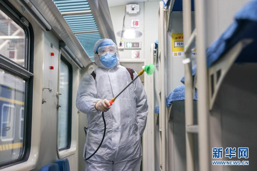 1月27日,防疫员胡亚东在卧铺车厢内喷洒消毒水。新华社记者 张楠 摄