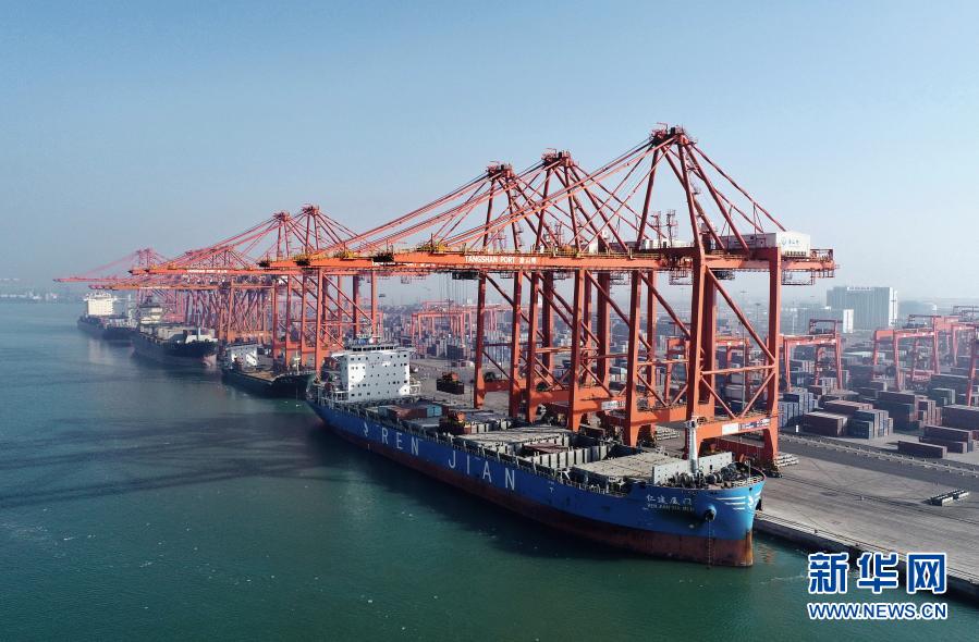 1月27日,轮船靠泊在唐山港京唐港区集装箱码头装载货物(无人机照片)。