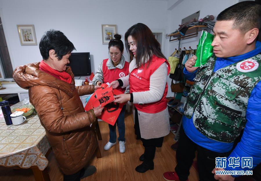 1月27日,祥和社区党员志愿者上门看望74岁的空巢老人沈梅琴(左一),送上春联、福字等慰问品,并询问老人的日常需求。沈梅琴老人的子女在外地,春节不能回家陪伴老人。