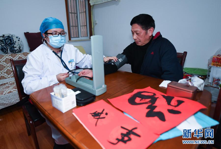 1月27日,环渚龙泉街道社区卫生服务中心医护人员在给祥和社区69岁的空巢老人万永明(右)上门体检。万永明老人的子女在外地,春节不能回家陪伴老人。新华社记者 徐昱 摄