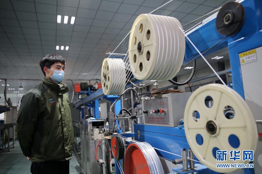 1月27日,在淮北市濉溪县经济开发区,工人在一家通信光缆生产企业车间内作业。新华社发(万善朝 摄)