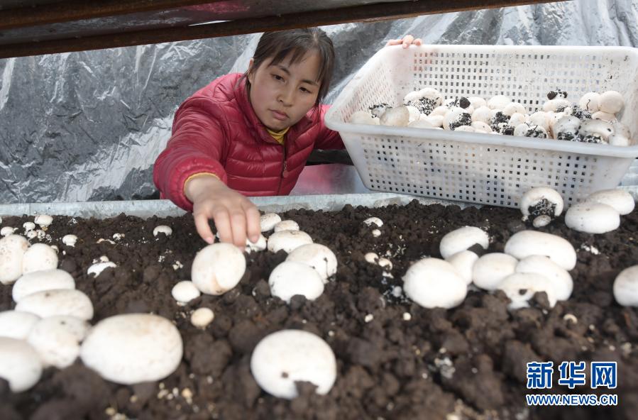 1月27日,工人在甘肃省临夏回族自治州临夏县先锋乡一食用菌产业园温棚里采收双孢菇。