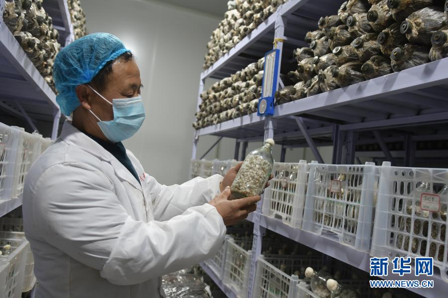 1月27日,工人在甘肃省临夏回族自治州临夏县先锋乡一食用菌产业园里观察菌丝长势。