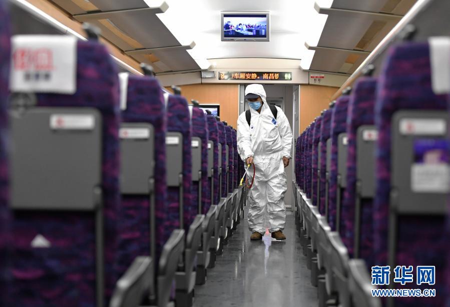 1月27日,工作人员在对动车车厢进行防疫消杀。