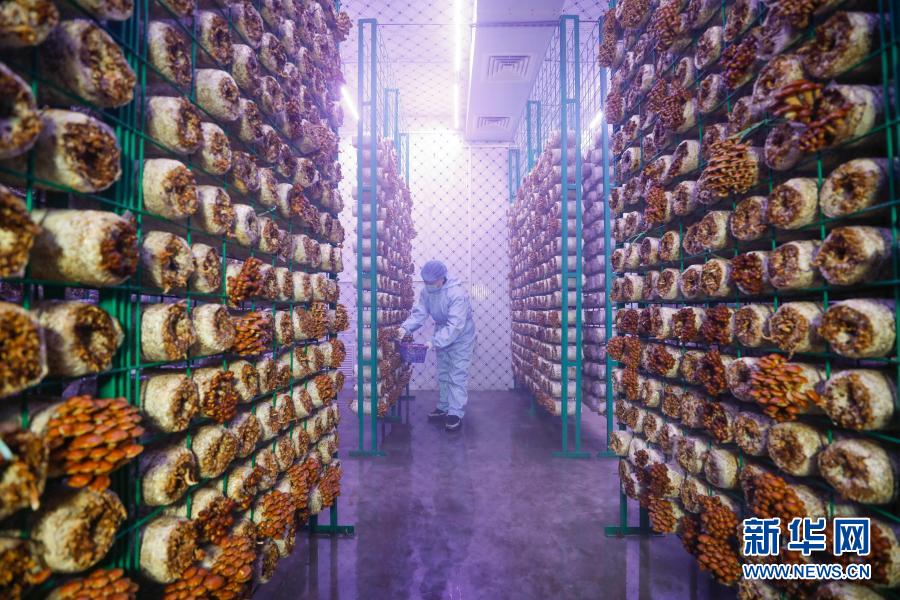 1月27日,工作人员在河南省平顶山市宝丰县周庄镇马川移民新村“智慧方舱”采摘滑子菇。