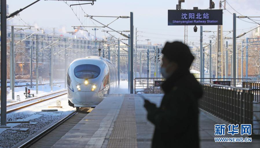 1月28日,一辆高铁列车即将进入沈阳北站。