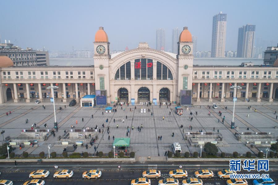 1月28日,旅客在汉口火车站进站乘车(无人机照片)。