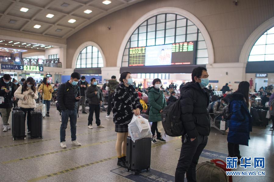 1月28日,旅客在汉口火车站保持间距排队进站。