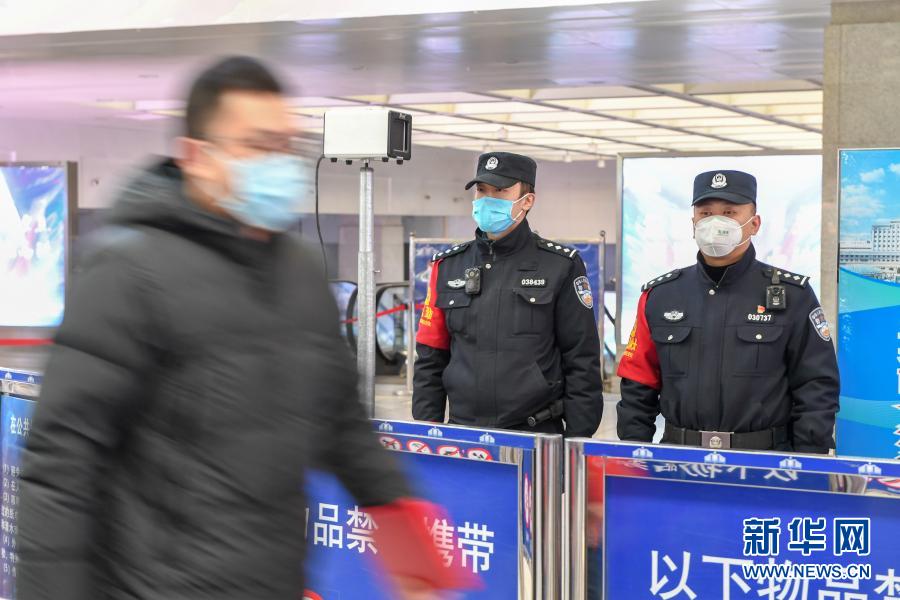 1月28日,长春铁路公安处长春车站派出所的民警在长春站候车大厅执勤。
