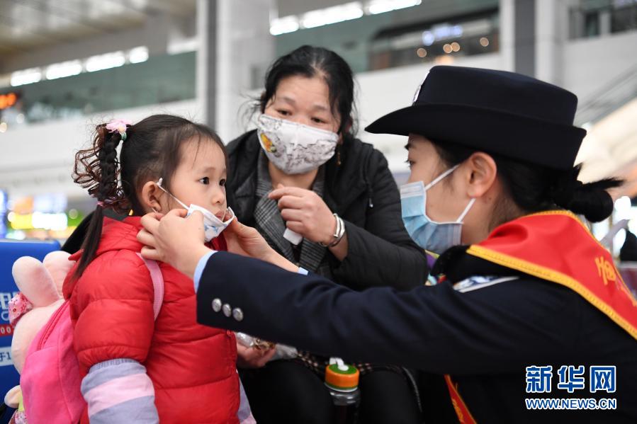 1月28日,重庆铁路民警在为小朋友整理口罩。