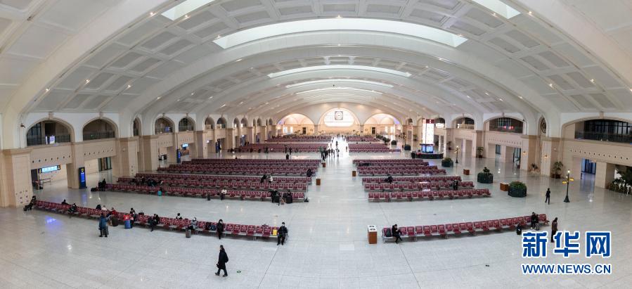 1月28日,在哈尔滨火车站候车厅,旅客在候车(拼接照片)。