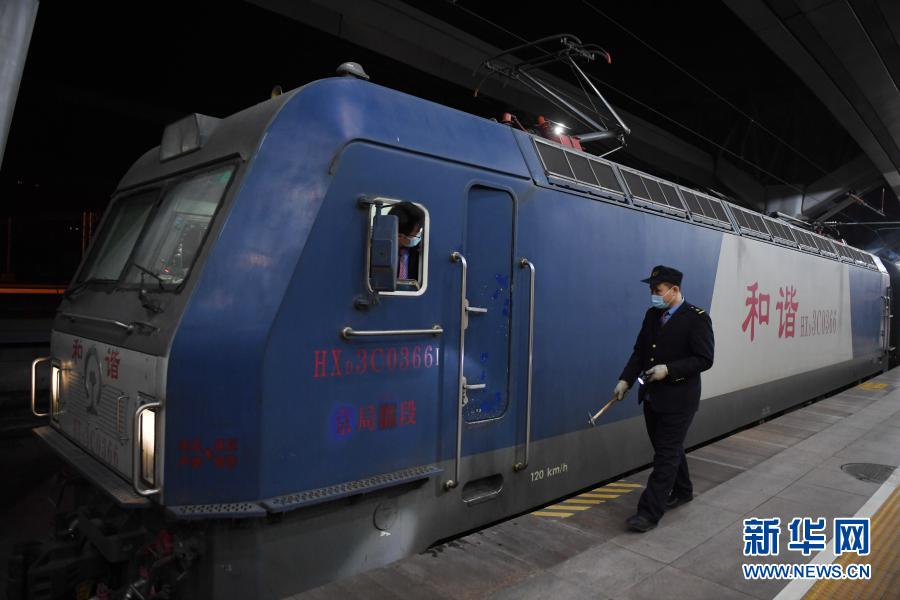 1月28日,工作人员在北京开往重庆西的3603次列车发车前进行检查。