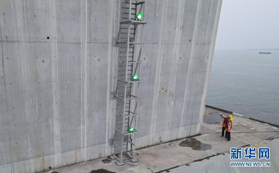 1月27日,中国铁路上海局集团有限公司上海工务段检修人员在沪苏通长江公铁大桥主塔承台上检查主塔外部结构 (无人机照片)。