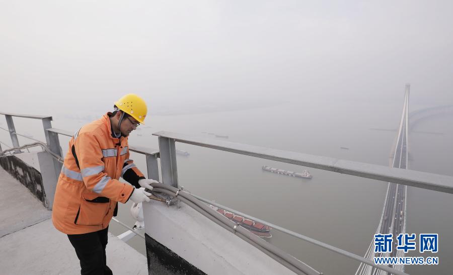 1月27日,中国铁路上海局集团有限公司上海工务段检修人员在沪苏通长江公铁大桥主塔上维护附属设备。