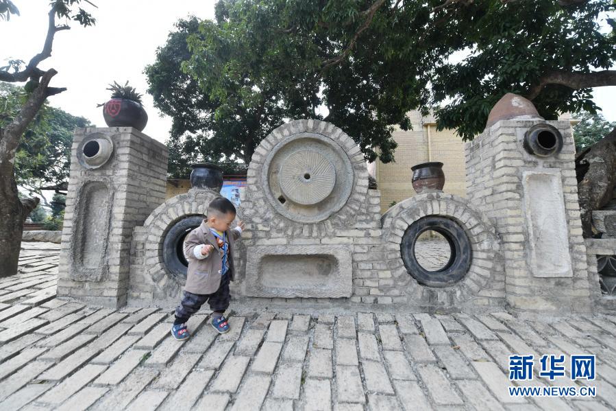 1月27日,在广西钦州市浦北县北通镇清湖村刘屋自然村,小朋友在废旧轮胎、石磨等打造的景观前玩耍。