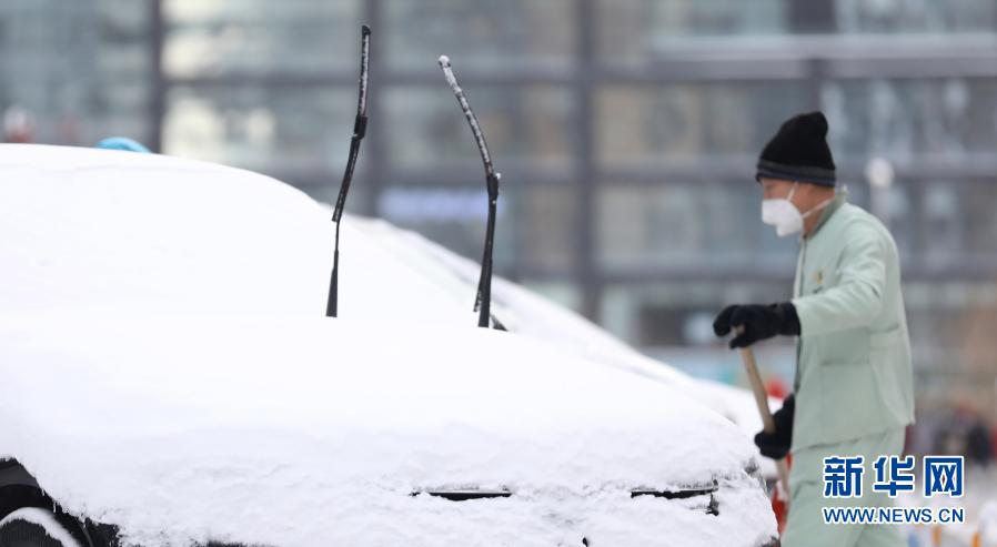 1月28日,在沈阳市浑南区,一名工作人员清扫停车场积雪。