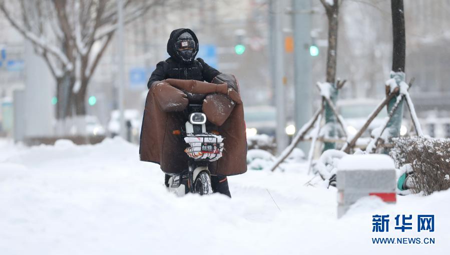 1月28日,在沈阳市浑南区,市民在积雪中骑行。