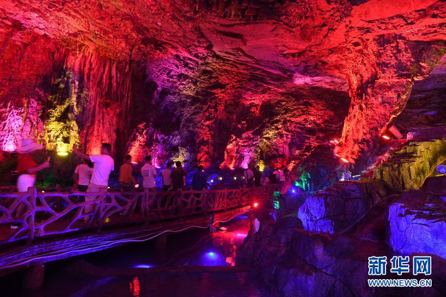 在贵州铜仁市万山区朱砂古镇景区,游客游览利用废弃矿洞开发的隧道(2019年10月5日摄)。