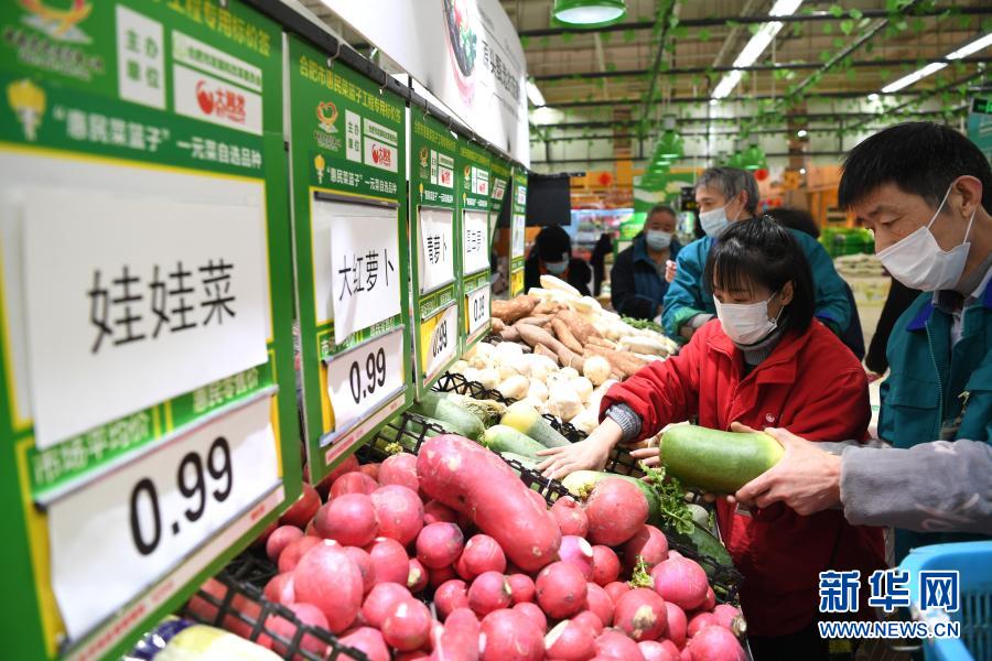 当日,安徽省合肥市启动春节“惠民菜篮子”工程。自2021年1月28日至2月10日,消费者可在全市24家企业的190家门店买到“惠民菜”。“惠民菜”20个规定品种以市场平均价为基准,蔬菜类下降15%以上,其他品种下降5%以上。同时,每天将推出不少于5个品种的蔬菜,以低于每斤1元的价格供市民选择。