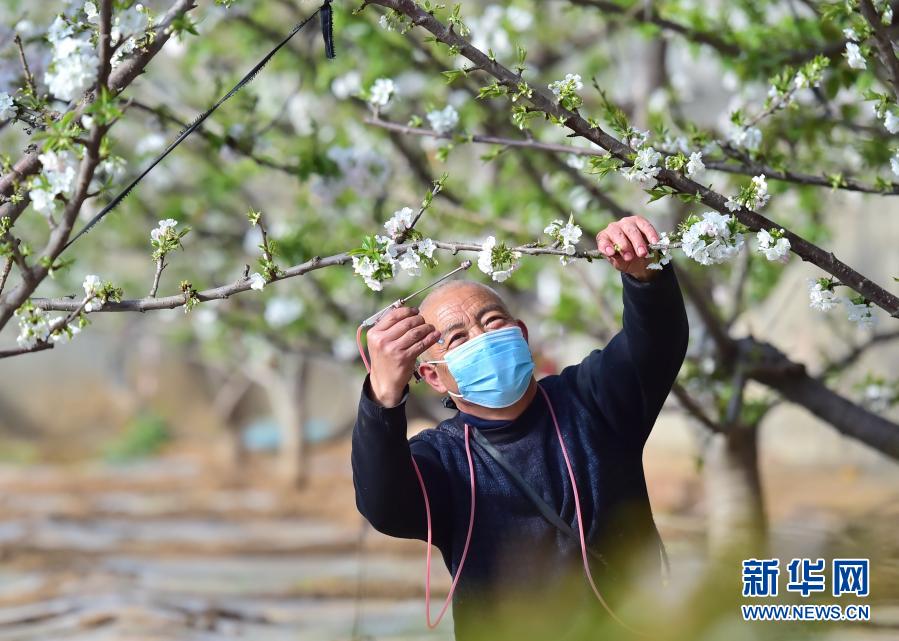 1月28日,赞皇县土门乡龙堂院村的一名果农在花果山生态农业园区大棚内给樱桃花授粉。