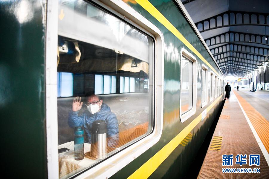 1月28日,在哈尔滨火车站,一位乘客在哈尔滨开往加格达奇的K7103次列车上向窗外挥手。