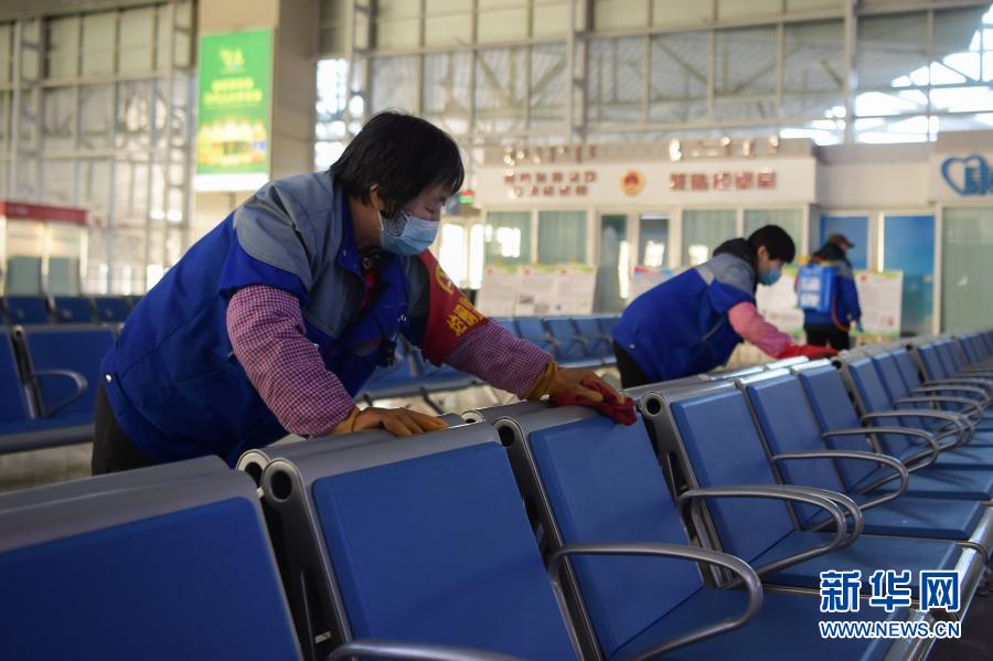 1月28日,在呼和浩特东火车站,工作人员在候车大厅内消杀。