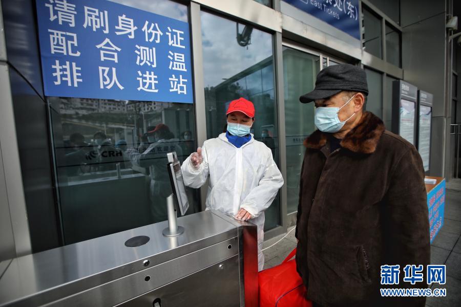 1月28日,一名旅客在贵阳北站测温进站。