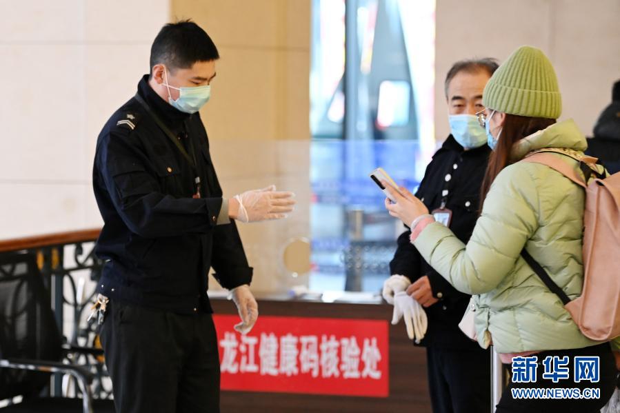 1月28日,在哈尔滨火车站入口处,工作人员查看旅客健康码。
