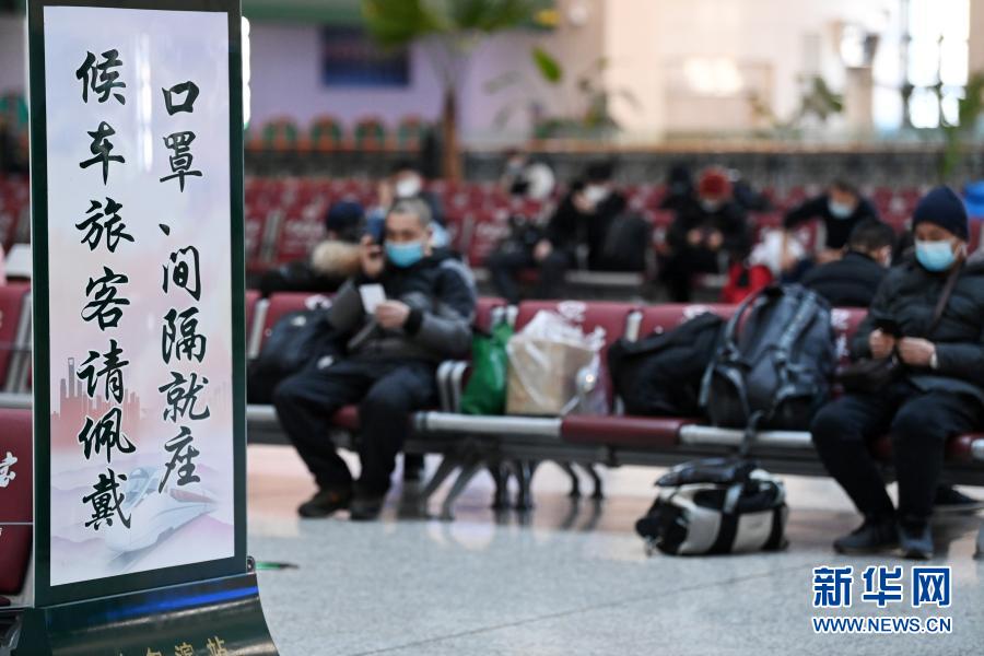 1月28日,在哈尔滨火车站候车厅,旅客戴口罩间隔而座。