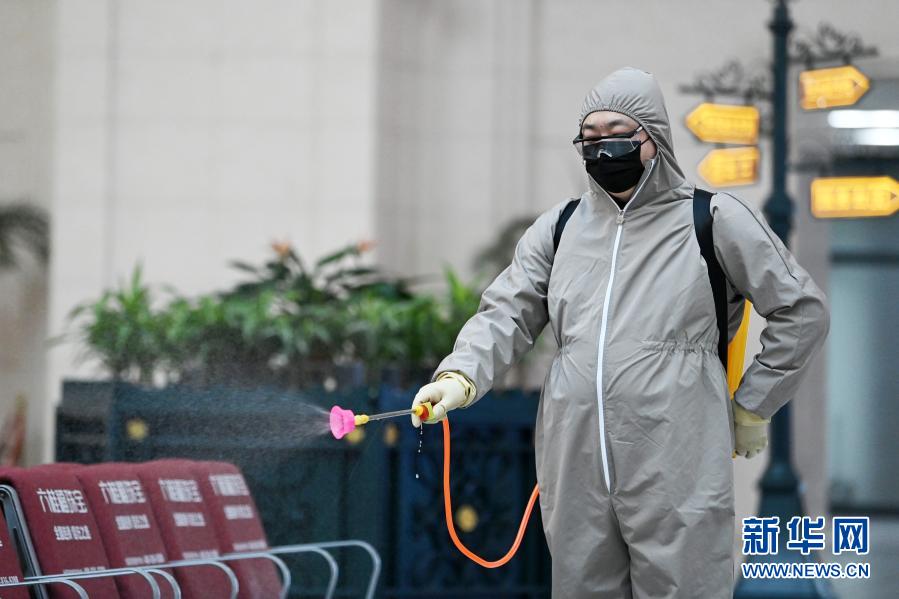 1月28日,工作人员在哈尔滨火车站候车厅消毒。