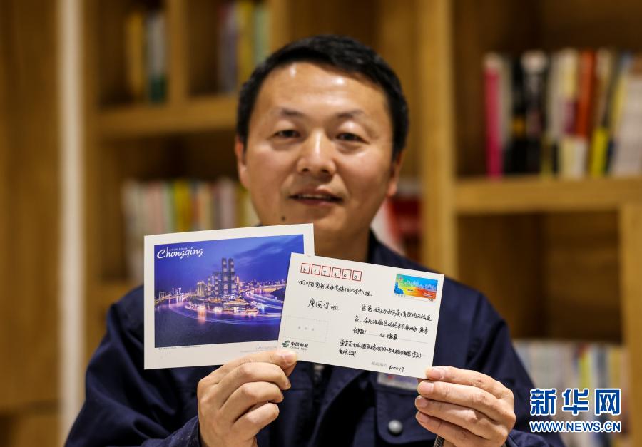1月28日,一名外地职工在展示自己给四川老家亲人写的新春贺卡。
