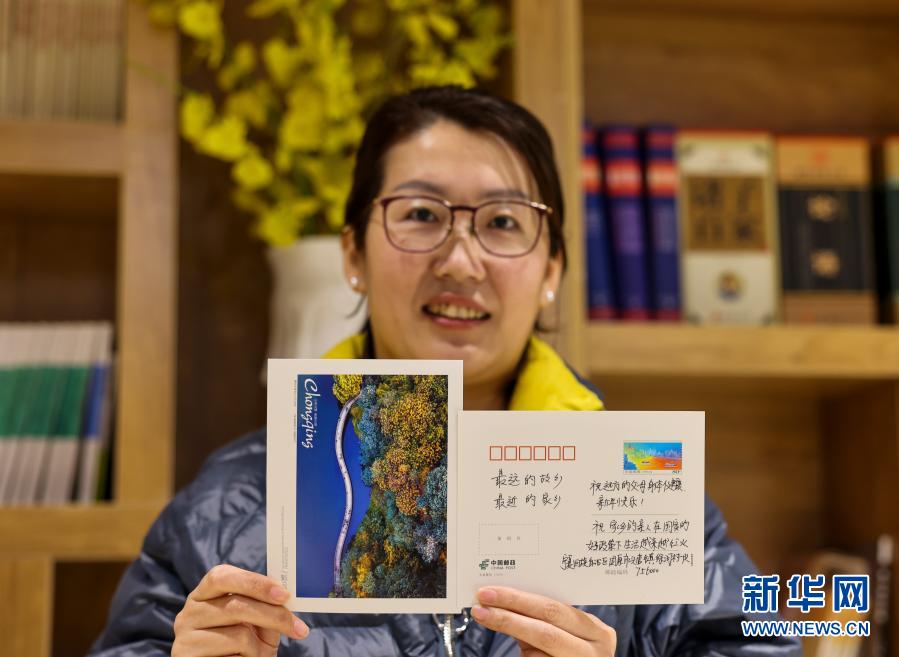 1月28日,一名外地职工在展示自己给宁夏老家亲人写的新春贺卡。