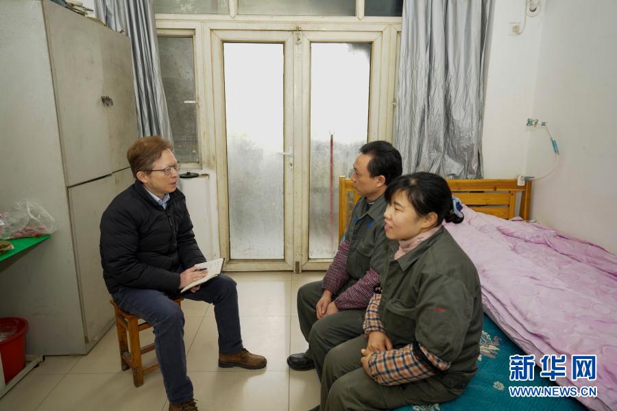 1月28日,在隆鑫通用动力股份有限公司B区的职工宿舍内,重庆市九龙坡区总工会的工作人员(左一)走访留渝过年的外地职工。