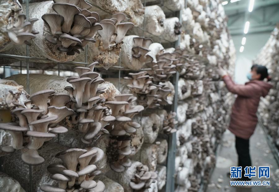 1月28日,赞皇县一家食用菌企业的工人在车间管护蘑菇菌棒。