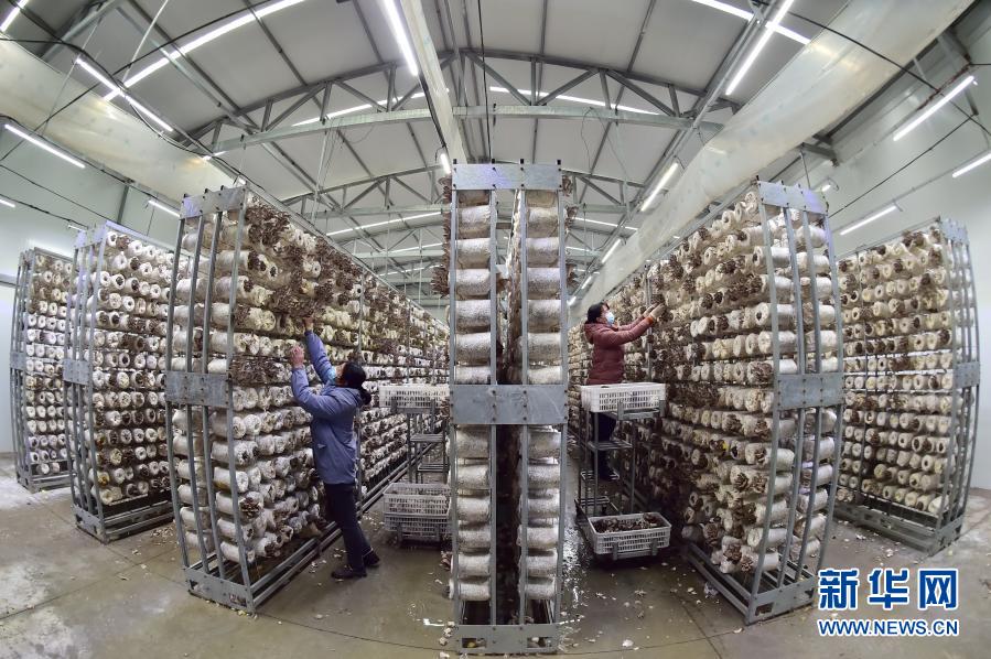 1月28日,赞皇县一家食用菌企业的工人在车间采摘蘑菇。