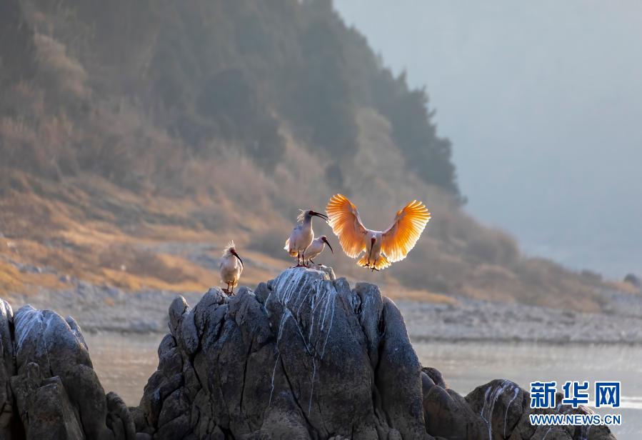 1月28日,朱鹮在洋县黄金峡镇庞湾村汉江段的河石上栖息。