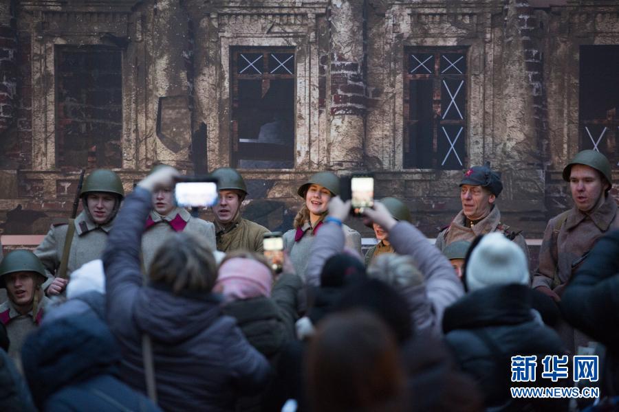 1月27日,参观者在俄罗斯圣彼得堡给“900日夜”参展人员拍照。