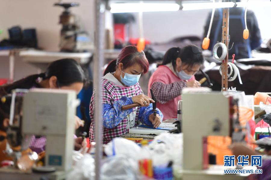 1月28日,在广西钦州市浦北县一家制鞋企业,工人在制作皮鞋。