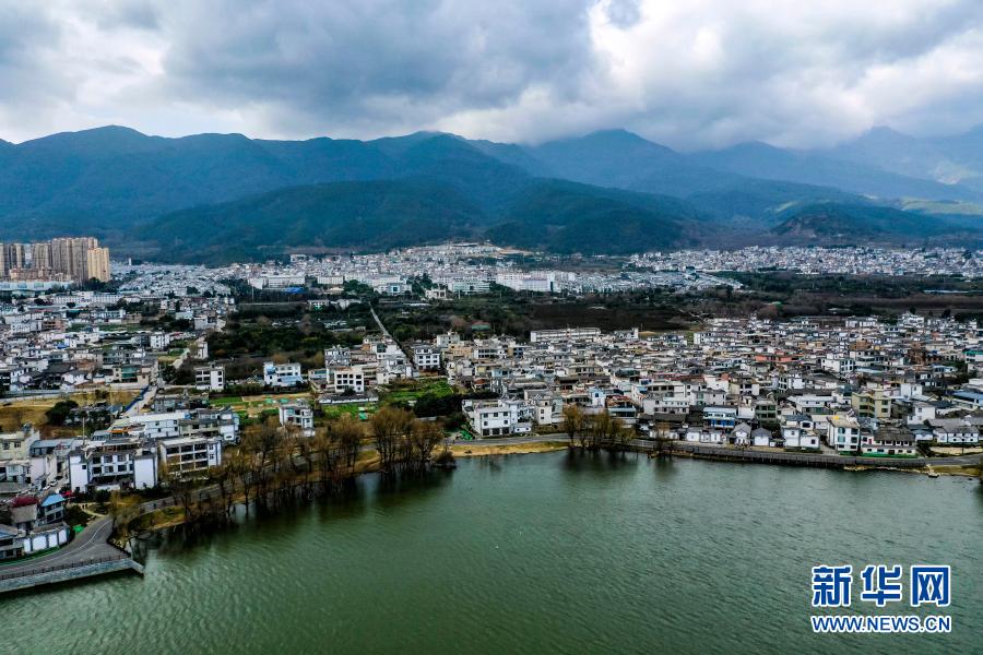 大理市环洱海流域湖滨缓冲带生态廊道逐步完善(1月11日摄,无人机照片)。新华社记者江文耀摄