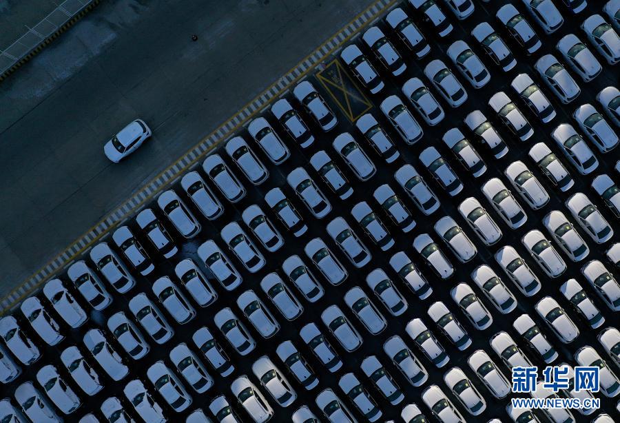 1月29日,一辆运送中的商品车行驶在大连港汽车码头(无人机照片)。