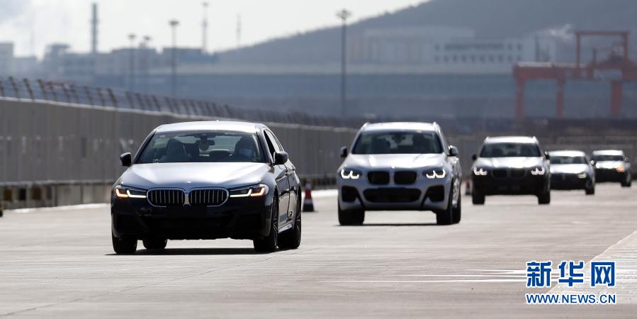 1月29日,冷永政(左一车内)和工友们驾驶商品车行驶在大连港汽车码头上。