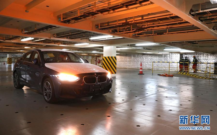 1月29日,冷永政(左一)驾驶商品车驶入滚装船船舱。