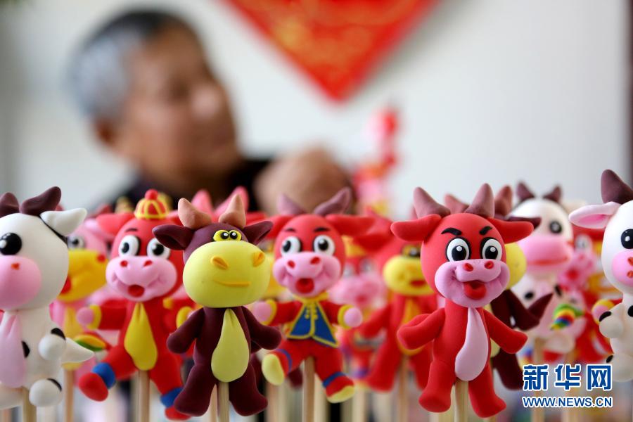 1月29日,民间艺人阚宗勤在家中创作面塑作品“百牛闹春”。新华社发(孙中喆 摄)