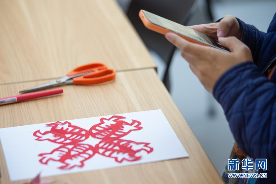 1月29日,职工为自己完成的剪纸作品拍照留念。新华社发(江汉 摄)