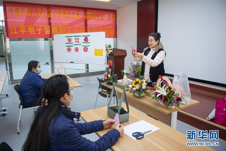 1月29日,手工老师向职工们示范剪纸方法。新华社发(江汉 摄)