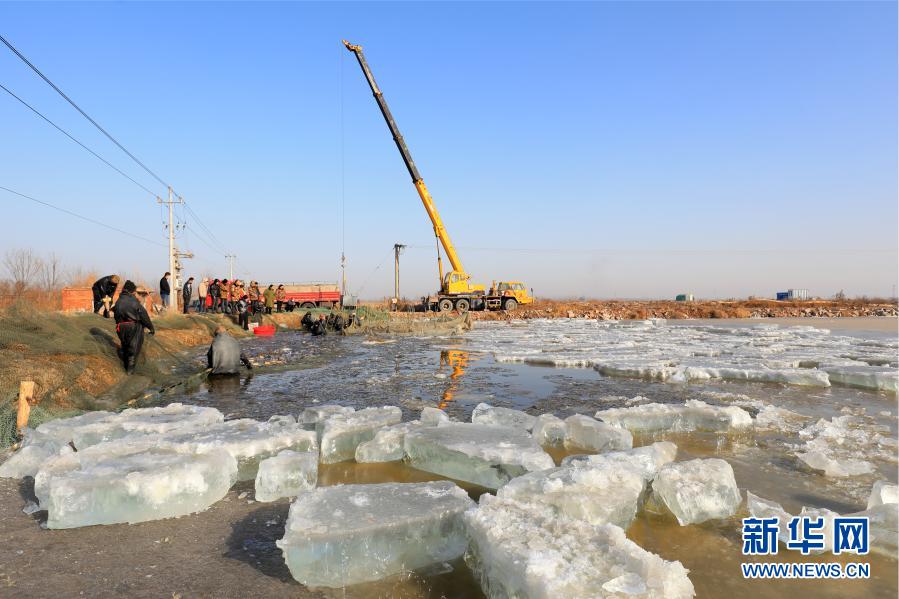 1月29日,河北省唐山市滦南县东黄坨镇西玉坨村一鱼池,起重机在吊装鲜鱼。